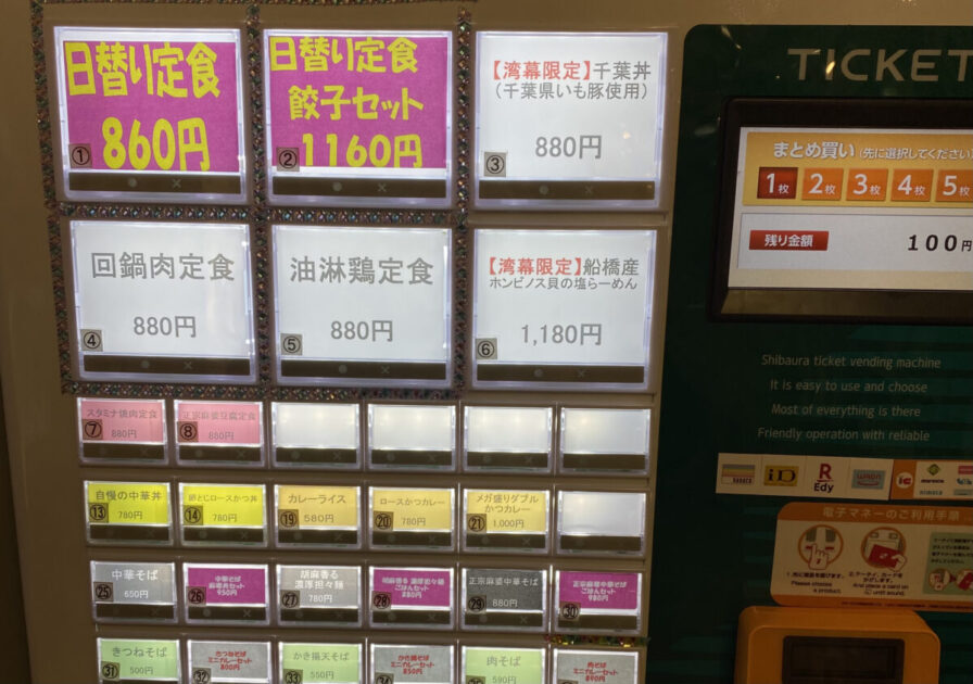 各種ICカードが利用できる券売機でメニューを選びますが、以前のメニューとそんなに変わってないかも?